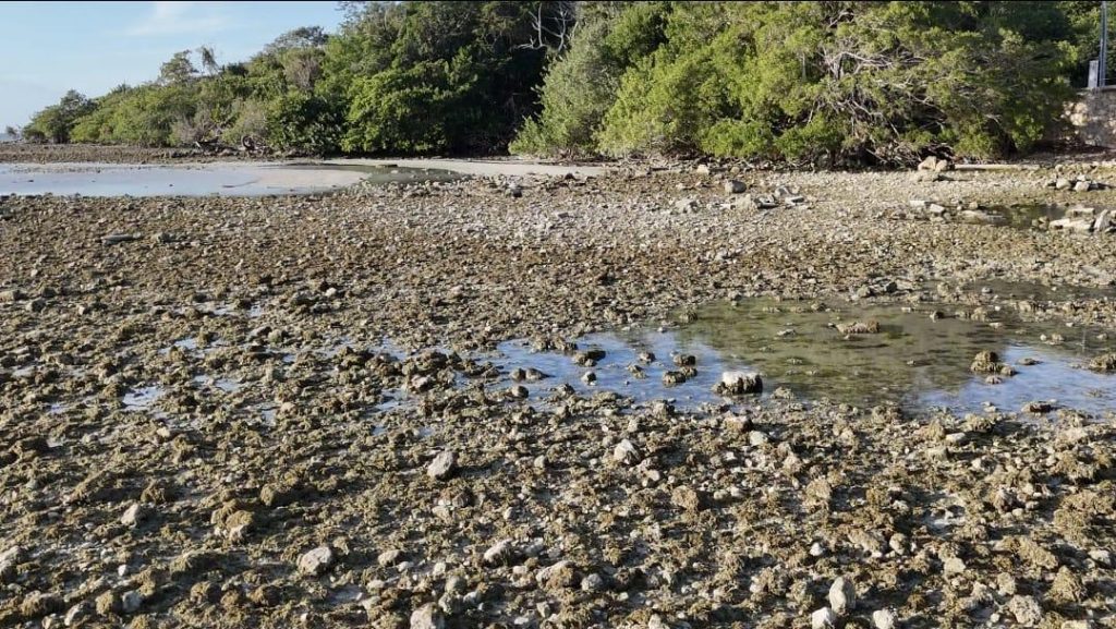 El retiro de agua en la Bahía de Chetumal, dejó expuesta una zona que normalmente supera el metro de profundidad.